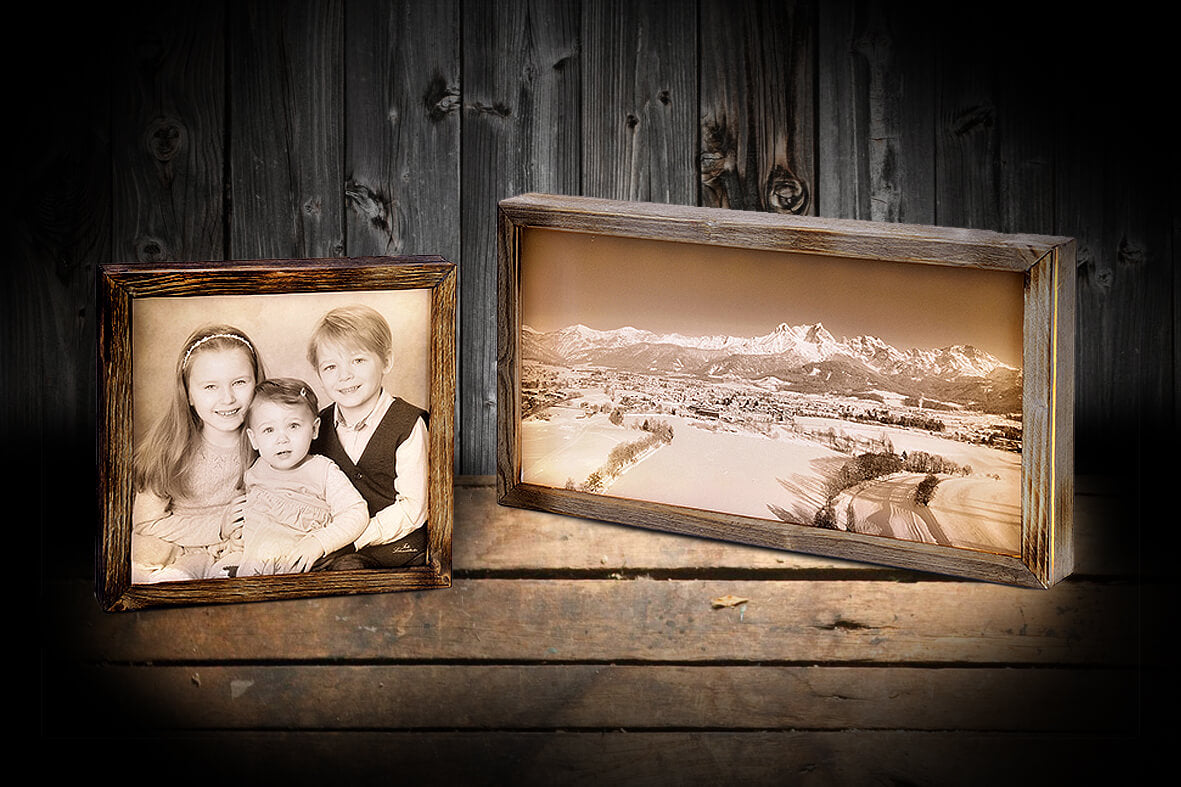 Unsere lasergravierten Holzbilder kannst du nach Lust und Laune mit Bildern, Texten oder Ornamenten für viele Anlässe gestalten. Die Kombination aus Altholzrahmen und Lasergravur erweitert unser Angebot.